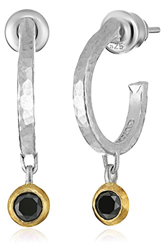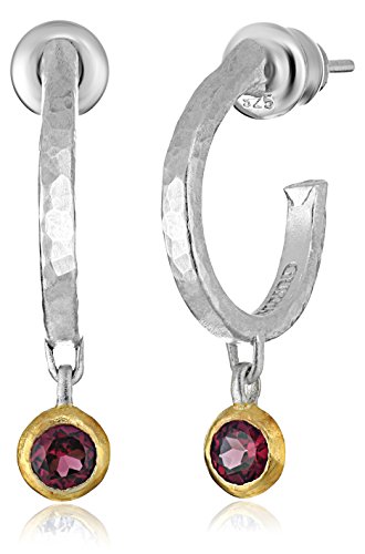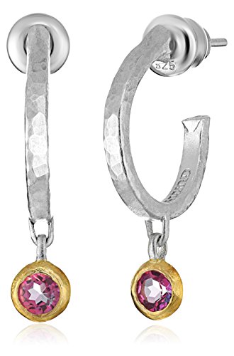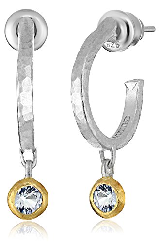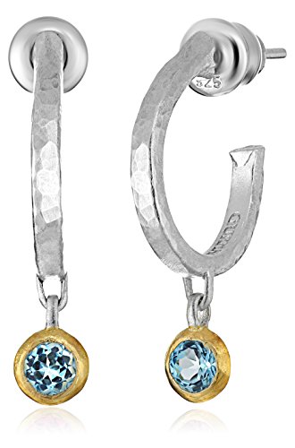 Sterling silver hoop earrings featuring round blue topaz drops set in a gold vermeil bezel