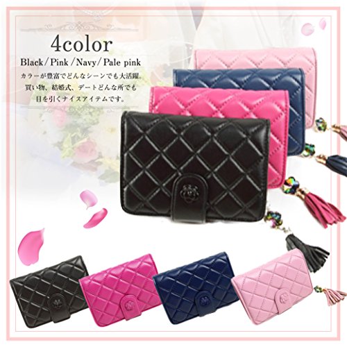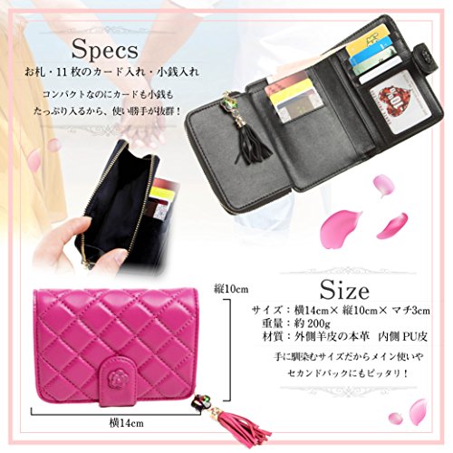 -. Feature : 羊皮が使用され、ふわふわのやわらかい材質なのでずっと触りたくなる心地良さがあります。 / タッセルにフラワー型のクリスタルもついてくるから見た目も可愛く高級感が増します。 / 可愛いフォルムで高級感があるのでデート・買い物・結婚式など多くのシーンで使いやすいです。 / 折り畳みでコンパクト!なのにお札・11枚のカード入れ・ジッパー付小銭入れがついていて使い勝手が抜群! / 手になじむサイズだからメイン使いやセカンドバックにもぴったり!