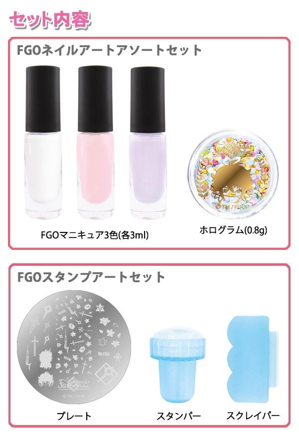 | セット内容 | 【FGOネイルアートアソートセット】 FGOマニキュア3色(各3ml)、ホログラム(0.8g) 【FGOスタンプアートセット】 プレート、スタンパー、スクレイパー |