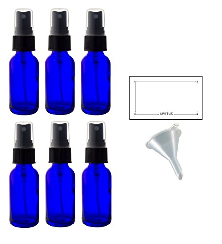 2 oz Cobalt Blue Glass Boston Round Fine Mist Spray Bottle (6 pack) + Funnel and Labels for essential oils, aromatherapy, food grade, bpa free