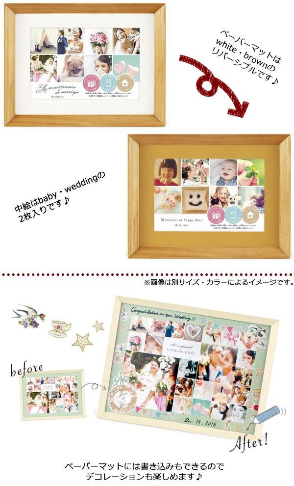 | スマートフォンなどの写真を、アプリや写真屋さんで手軽にランダムに配置して印刷できるサービスに最適なフォトフレーム。細かな写真をたくさん並べても邪魔せずそっと引き立ててくれるスッキリとしたデザインが魅力です。天然木を使用した上質な雰囲気に加え、リバーシブルのペーパーマットには書き込みもできるので、寄せ書きやデコレーションを施して贈り物にするのもオススメです。 |
