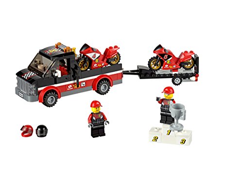 -. Feature : Enthält 2 Rennfahrer-Minifiguren mit passender Ausrüstung. / Ebenfalls enthalten: Ein Pickup-Truck mit Auffahrrampe, ein Anhänger mit herunterklappbarer Auffahrrampe, 2 Rennmotorräder, ein Siegerpodest und ein Pokal. / Zubehör: Ein Feuerlöscher, ein Schraubenschlüssel und 2 Sturzhelme. / Klapp die Auffahrrampe am Anhänger herunter. / Lade die Rennmotorräder ab.