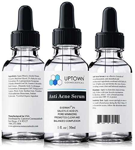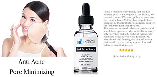-. Binding : Misc. -. Brand : Uptown Cosmeceuticals -. EAN : 0685987989199 -. Feature : Uptown Cosmeceuticals Anti Acne Serum is a Potent Formula that offers Real Results; Our simple, yet effective formula of anti-inflammatory, anti-microbial and anti-bacterial ingredients combined with Salicylic Acid, EvermatTM, Manuka Oil and Lemongrass oil takes over that hostile skin providing a more clear and balanced complexion / Salicylic Acid 2% - Beta Hydroxy Acid (BHA), provides exfoliation preventing pore clogging and smoothing fine lines/wrinkles, helps with new cell growth and reduces inflammation / EvermatTM(Enantia Chlorantha Bark Extract, Oleanolic Acid) is known to be a good pore minimizer and helps reduce pore size and skin shine. Leptospermum Scoparium, Known as Manuka Oil, provides antibacterial, anti-microbial, anti-fungal and antioxidant activities to protect and restore the skin. Cymbopogon Schoenanthus (Lemongrass) Oil is an antioxidant with antiviral and anti- bacterial properties and very effective for acne skin care / Acne Control Serum is Made in USA and works for Men, women, teens, all skin types. Perfect alternative to expansive acne treatment products. / Purchase with complete peace of mind, we are confident we have developed one of the absolute best anti acne products available. If you are not completely satisfied with Uptown Cosmeceuticals anti acne serum, we will refund your entire purchase -. MPN : 3176882 -. PackageQuantity : 1 -. PartNumber : 3176882 -. ProductGroup : Beauty -. ProductTypeName : BEAUTY -. Title : Anti Acne Serum for Men, Women & Teens From Uptown Cosmeceuticals Offers Cutting Edge Skin Care Product That Helps to Control & Get Rid of Acne, Best Pore Minimizer Treatment, 30ml -. UPC : 685987989199
