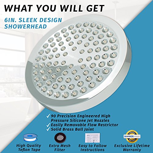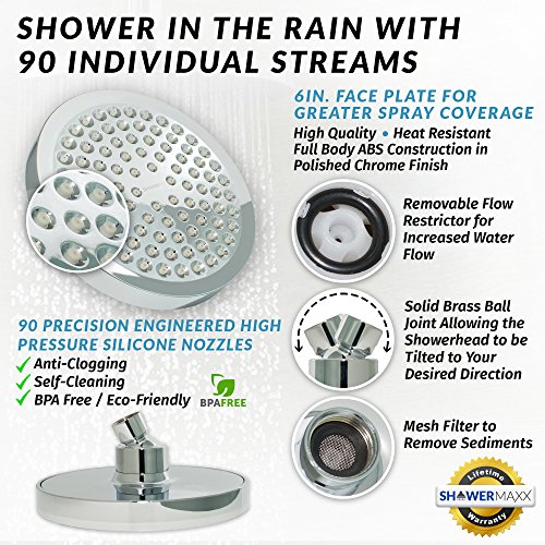 ►90 PRECISION ENGINEERED HIGH PRESSURE NOZZLES - Imagine stepping into your very own luxury spa experience each morning. Your ShowerMaxx® is elegantly crafted with 90 precision-engineered high pressure jets and a wider 6 inches face plate to give you a soothing experience and make you feel refreshed and rejuvenated with every shower! Adjustable ball joint allows easy and flexible adjustment to achieve the perfect angle for your bath area.