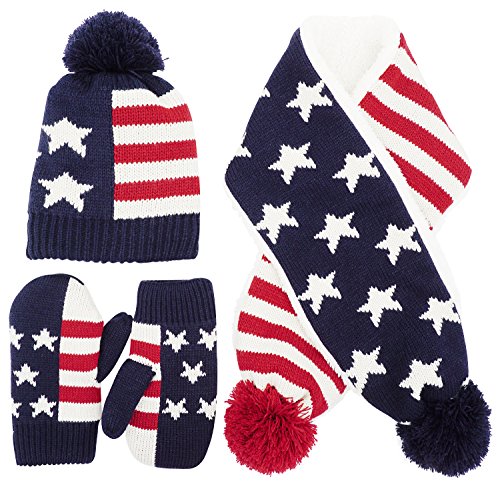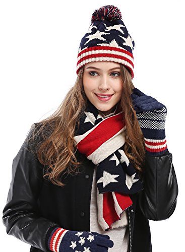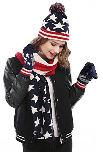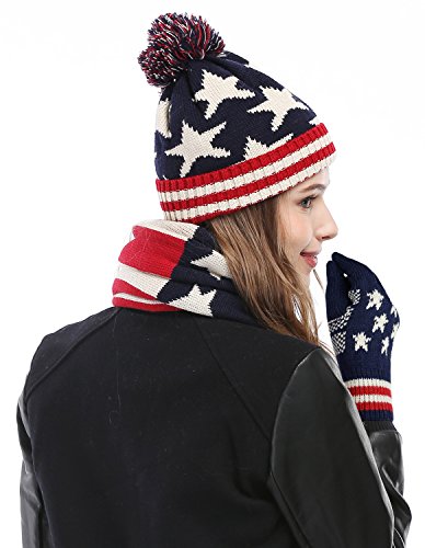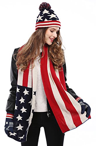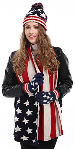 Bienvenu Women's Adult USA American Flag Star Print Red White Knitted Hat Beanie Scarf Gloves Set