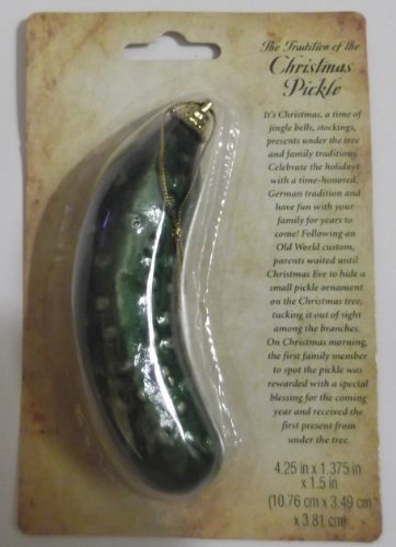 -. Feature : pickle ornament with green glitter finish / Measures 4 inches long / The tradition is P.R.Inted on the package