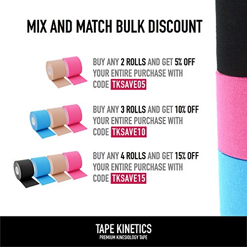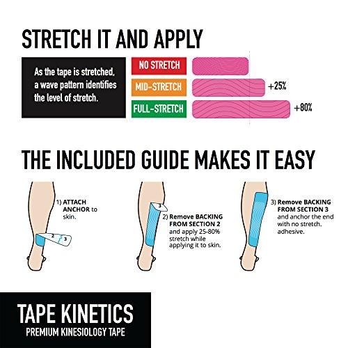 -. Feature : LEAVE THE BRACES AND RESTRICTIVE ATHLETIC TAPE BEHIND. SAY HELLO TO FULL RANGE OF MOTION. Our lightweight elastic cotton kinesio tape moves with your body. It provides gentle support and aids recovery by increasing blood flow to the taped areas. / GO THE EXTRA MILE WITH OUR SWEAT PROOF, WATERPROOF AND TEARPROOF TECHNOLOGY. When properly applied, our kinesio-tape adhesive can stay on through 3-5 days of showering, crossfit workouts, iron-distance triathlons, ultra-marathons, and beyond. This athletic tape is also LATEX FREE. / ENDLESS PERSONALIZATION OPTIONS - CUT IT TO A SIZE THAT FITS. While pre-cut kinesiology tape strips have their place, a continuous roll of tape gives you unlimited options for size. Never get stuck with pieces of tape that don't fit. Refer to our included kinesio taping directions for some of the most common applications. Use scissors and cut pieces that work for you. / INCREASE WORKOUT RECOVERY AND DECREASE MUSCLE FATIGUE AND PAIN. Our tape gently lifts the skin to promote better blood flow for increased athletic performance and quicker recovery from injuries. Use our kinesio-tape for Crossfit, Running, Cycling, Triathlons, Swimming, Cycling, Weight Training and Yoga. Tape up your achilles, knee, shin splints, shoulders, calves, glutes, abs or any other body part that needs support. / YOU'LL BE HAPPY - WE PROMISE. 100% Satisfaction Guarantee - if our TAPE KINETICS Premium Kinesiology Tape doesn't meet your needs, let us know and we'll provide a full refund or send you a new roll of tape.