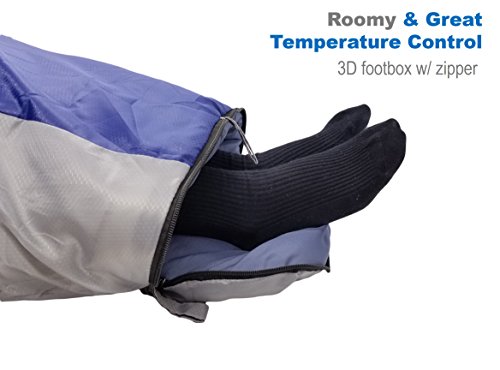 ROOMY & BETTER TEMPERATURE CONTROL - Bigger than most mummy bag (87" x 33" x 22"), fits most body types up to 6'6". Specially designed 3D foot box with zipper gives you better comfort and control.