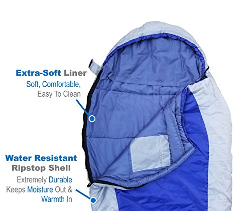 STAY WARM AND COZY THROUGHOUT THE NIGHT (32F - 55F) - High loft filling to keep you warm. Breathable, soft, brushed liner for a great night of sleep. Full-length zipper baffle reduces drafts. Drawstring hood covers your face and head to keep warm.