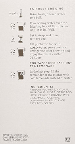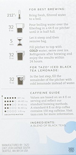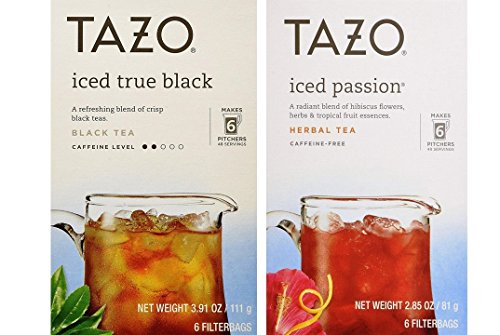 -. Binding : Misc. -. Brand : TAZO -. EAN : 0752454689538 -. Feature : Each box makes 6 pitchers; 6 filter bags in each box / Specially formulated for delightful iced tea in minutes / Packaging may vary / Convenient 2 flavor sampler - 1 of each / This item is not a manufacturer-created variety pack and will not be sent in the original manufacturer's packaging -. IsAdultProduct : 0 -. Label : Tazo -. Manufacturer : Tazo -. PackageQuantity : 2 -. ProductGroup : Grocery -. ProductTypeName : GROCERY -. Publisher : Tazo -. Studio : Tazo -. Title : Tazo Iced Tea Pitcher Bag 2 Flavor Variety Bundle; (1) Passion, and (1) True Black (6-Count) -. UPC : 752454689538
