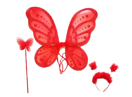 -. Binding : Toy -. Brand : LolaSaturdays -. Color : red -. Department : girls -. EAN : 0745720586570 -. Feature : 14" X 16" RED WING SET, 1 WING WITH MATCHING WAND AND HEADBAND / Made of soft nylon fabric over a wire wing construction that allows for the wing to be bent into the desired angle / Glitter designs and feathers Accents. / Great size for Girls of all ages. / Elastic Bands for convenient wearing, can fit adults. -. Label : LolaSaturdays -. Manufacturer : LolaSaturdays -. PackageQuantity : 1 -. ProductGroup : Toy -. ProductTypeName : TOYS_AND_GAMES -. Publisher : LolaSaturdays -. Size : 3-16 -. Studio : LolaSaturdays -. Title : LolaSaturdays 3 Pc Set Red Fairy Princess Butterfly Angel Costume Dress-up Wings -. UPC : 745720586570