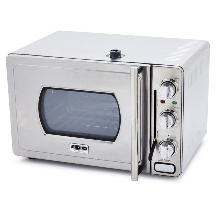 Cook mouthwatering meals in a fraction of the time with this groundbreaking low-pressure oven from culinary legend Wolfgang Puck. Using the same principles as stovetop pressure cookers, but operating at much lower pressures, this compact countertop oven seals in heat and moisture, concentrates flavors and dramatically decreases cooking times. Five cooking methods, fully adjustable temperature settings and an integrated timer provide complete control, while the smart, efficient design makes it as easy to use as a standard oven. Whether cooking a full-sized turkey in minutes or baking a batch of cookies, this quick and convenient oven lets you spend more time enjoying your meals and less time cooking them. Available in stainless steel with either chrome knobs (exclusive) or black knobs. Manufacturer: KitchenTek. Model: WPROR1002SLT. Includes: Oven, roasting pan, bake/drip pan, removable crumb tray, broil rack, recipe booklet, user guide. Material: Stainless steel, glass, rubber. Care: Wipe exterior clean with damp cloth. Removable components (pans, racks, crumb tray) are dishwasher safe. Dimensions: 19.9" x 15.6" x 17.9" (exterior); 14.5" x 12" x 10" (interior). Capacity: 29 L. Weight: 27 lb.. Watts: 1700. Warranty: 1-year limited manufacturer's warranty. Made in China . FEATURESFlavor Infusion Technology creates a pressurized cooking environment that seals in heat and moisture and concentrates flavors. Low-pressure cooking cooks meals up to 70% more quickly than conventional ovens-great for beef, poultry, vegetables and even baked goods. Pressurized environment operates at much lower pressures than standard pressure cookers for gentle, precise cooking and exceptional results. Five cooking methods: bake, broil, roast, toast and warm or reheat. Integrated timer turns oven off when cooking is complete and keeps it warm until ready to serve. Large, 29-liter capacity accommodates a wide variety of foods or a 14" x 12" baking pan. Easy-to-use lock makes it easy to set andFeature