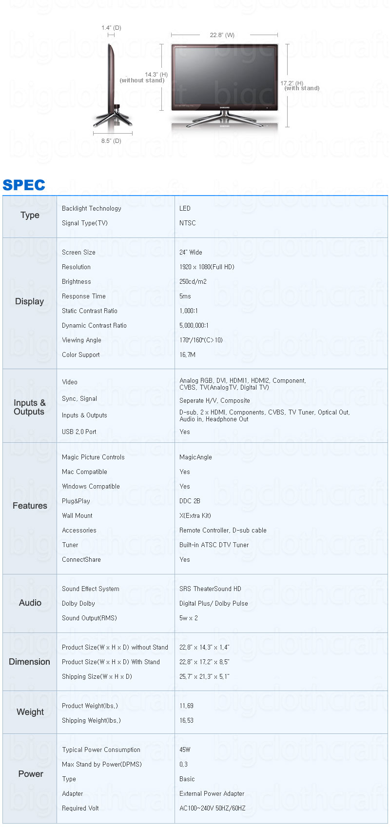 Product Size(W x H x D) without Stand: 22.8" x 14.3" x 1.4"