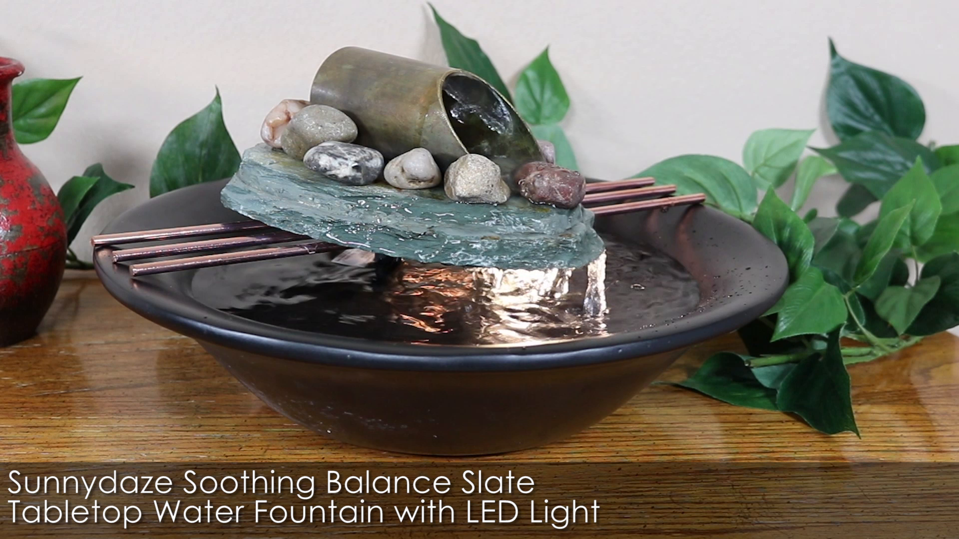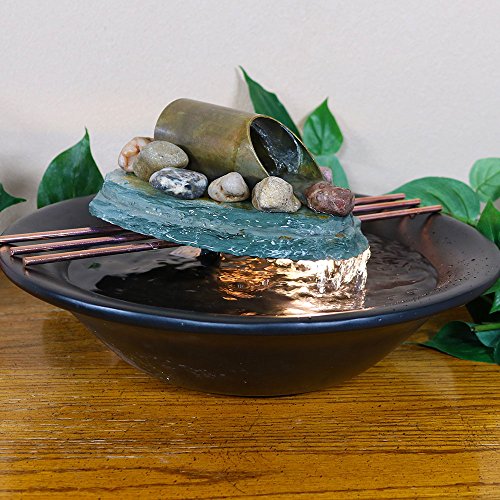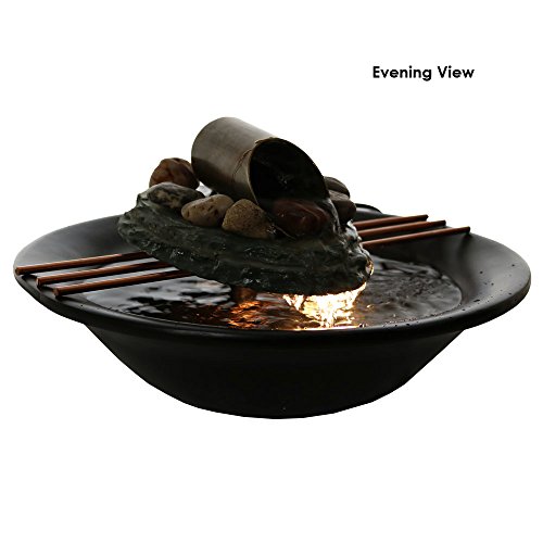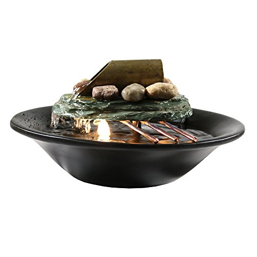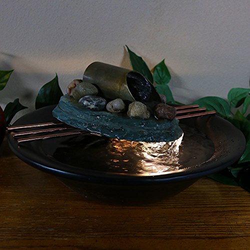 - This indoor fountain features a polished black resin bowl, topped with decorative copper coated metal rods, a small slate slab and a metal tube where the water flows from. *Colors may vary slightly from on-screen images as every piece of slate varies.