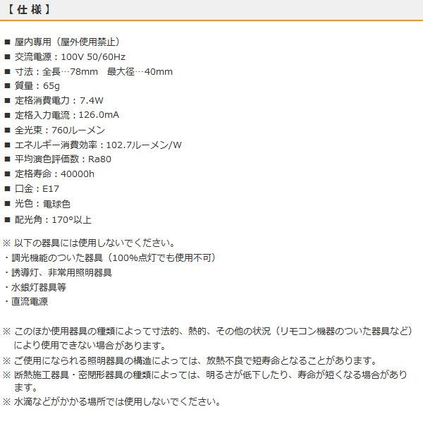 小形電球60形相当の明るさ。密閉形器具/断熱材施工器具対応。光色は電球色です。