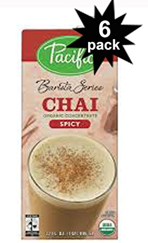 -. Binding : Misc. -. Brand : Pacific Natural Foods -. EAN : 0789296613384 -. Feature : 6 Pack of 32oz Barista Series Organic SPICY CHAI LATTE Concentrate by Pacific Natural Foods / authentic chai flavor / CertifiedTM organic / Made with Fair Trade black tea in small batches and combine with cane juice, honey and a robust blend of cardamom, ginger, nutmeg, cinnamon, clove and black pepper / The result is a warm, spicy flavor profile with a hint of sweetness -. IsAdultProduct : 0 -. Label : Pacific Foods of Oregon -. Manufacturer : Pacific Foods of Oregon -. PackageQuantity : 6 -. ProductGroup : Grocery -. ProductTypeName : GROCERY -. Publisher : Pacific Foods of Oregon -. Size : 32 Ounces -. Studio : Pacific Foods of Oregon -. Title : Barista Series Organic Spicy Chai Latte Concentrate 32oz. (6 Pack) -. UPC : 789296613384