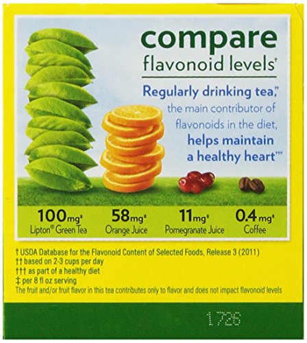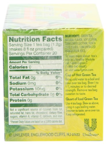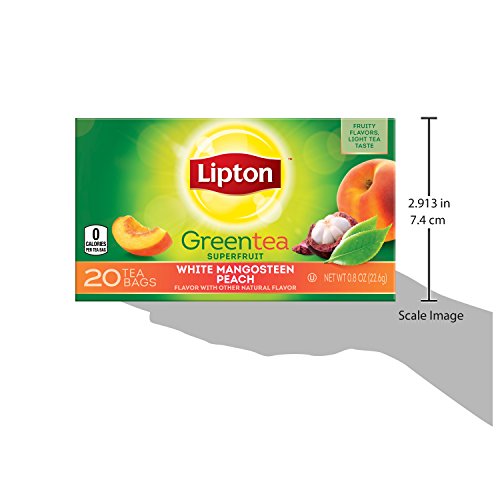 -. Binding : Grocery -. Brand : Lipton -. Feature : Has the unique blend of the exotic flavors of mangosteen and peach with Lipton's special green tea / Pack of six 20-count tea bag boxes (total 120 tea bags) / Contains 110 mg of flavonoids per 8 fluid ounce serving, is 100% natural, no preservatives or coloring / Green tea superfruit is a perfect addition to your healthy lifestyle / Ships in Certified Frustration-Free Packaging -. IsAdultProduct : 0 -. Label : Lipton -. Manufacturer : Lipton -. Model : 10041000072397 -. MPN : 72397JCA30 -. NumberOfItems : 6 -. PackageQuantity : 6 -. PartNumber : 72397JCA30 -. ProductGroup : Grocery -. ProductTypeName : GROCERY -. Publisher : Lipton -. ReleaseDate : 2010-03-31 -. Studio : Lipton -. Title : Lipton Green Tea, White Mangosteen Peach 20 ct (Pack of 6)