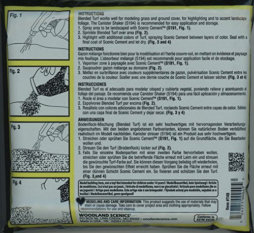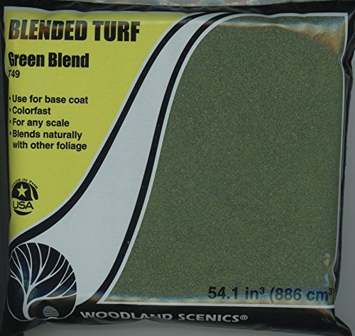 Studio : Woodland Scenics Publisher : Woodland Scenics Binding : Toy Product Description Blended loose Green Turf powder by Woodland Scenics. For use on any scale miniature setting. Use for grass and foliage in your miniature setting. Realistic Color. Instructions included. Covers approx. 54.1 cubic inches.
