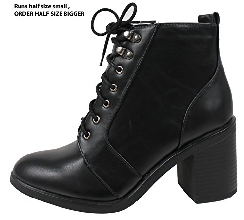 Product DescriptionCombat ankle boot featuring almond shape toe, lace up with inner zipper for easy on/off and chunky heel approx 3", and shaft height including heel 7".( Size 7 measurement)0