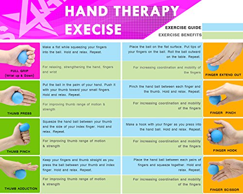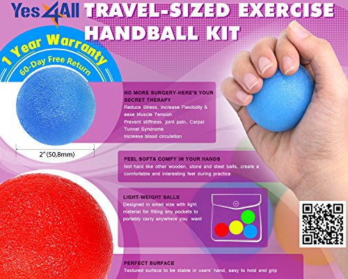 Studio : Yes4All Publisher : Yes4All Binding : Sports Product Description Hand exercise strengthener Squeeze your stress away with Yes4All Hand Exercise Ball. With just few minutes practicing every day, your hands become stronger and more flexible than ever. By simply squeezing over and over and exercising with the balls, you can: -Develop and strengthen your grips, hands, fingers, forearms and wrists for better sport performance -Release stress, tension from overused hand texting, typing -Alleviate the hand pain, joint pain associated with arthritis. -Improve circulation, flexibility, dexterity for stiff hands, wrists. Warranty Return: Yes4All Hand Excercise Balls come with 60-day Free Return and 1 year Warranty. *Therapy note: Especially good for rehabilitation after injuries, damaged nerves, mobilized fingers. It's easy, fun and convenient as you can take them anywhere. The kit comes with 3 colored balls so you leave them at home, in your car or take to your office and relax your fatigued hands at any time. The all-in-one Yes4all Hand Exercise Ball is really a good value of your budget! 0
