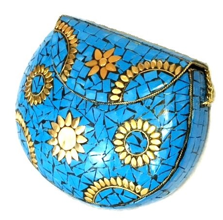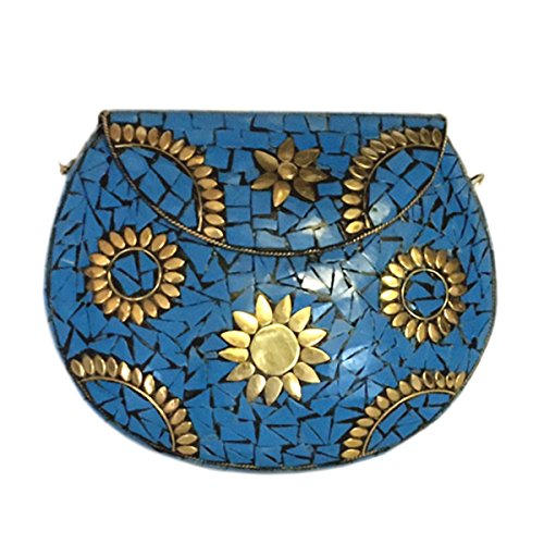 Alvi Overseas Handmade Blue Metal Sheet Clutch bag with antique Strong chain,inner side is fabric coated. Party wear look and this unique look bag can Accommodate Cellphone and other small accessories,Design in purpose to give attractive attention in Function,Party. Rhinestone clasp closure.The Golden metal sheet clutch has Golden Plating Beautifull Design as per showing image.Metal parts are resistible to rust. Attached chain strap allows you to wear the clutch purse as a crossbody bag that hits at the hip. The clutch wallet is roomy enough to keep your cell phone, car keys, credit cards, lipsticks important documents safely.Feature