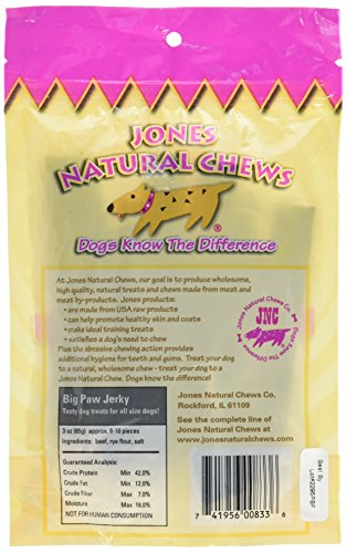 -. Binding : Misc. -. Brand : Jones -. EAN : 0741956008336 -. Feature : Made In The Usa / Made With 100% Made In The Usa Beef / Contains no artificial ingredients / Oven Baked To Seal In Fresh Beef Taste / Perfect For Training, Reward, Or As An Occasional A Snack -. Label : Dealfisher -. Manufacturer : Dealfisher -. Model : 195048 -. MPN : 195048 -. NumberOfItems : 1 -. PackageQuantity : 1 -. PartNumber : 195048 -. ProductGroup : Pet Products -. ProductTypeName : PET_SUPPLIES -. Publisher : Dealfisher -. Size : Large -. Studio : Dealfisher -. Title : Jones Natural Chews Beef Jerky Dog Treat, Large -. UPC : 741956008336
