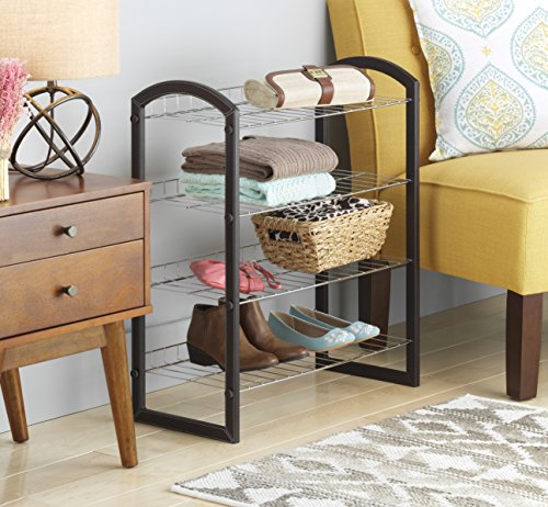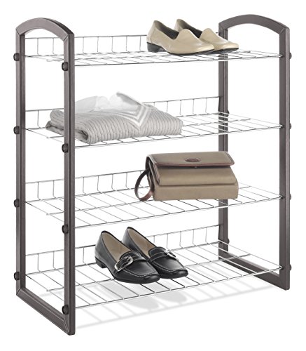 - 4 chrome metal grid shelves hold all sorts of items, from shoes and accessories to book bags and supplies