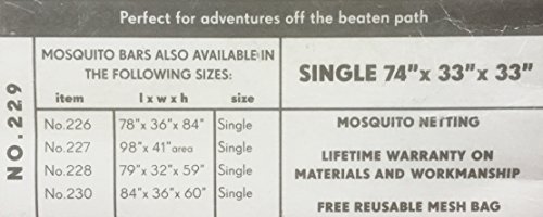 -. Brand : Mosquito bar -. Color : green -. EAN : 0640823841123 -. Feature : Camp-Inn Mosquito Bar, protection from nature`s flying insects 74" x 33" x 33" / Tie-off ropes at top corners for stability / Accommodates full-size sleeping bag / Finely woven mosquito netting / Includes reusable mesh bag -. Label : Cerf Bros Bag Co -. Manufacturer : Cerf Bros Bag Co -. MPN : 229Z-M -. PackageQuantity : 1 -. PartNumber : 229Z-M -. ProductGroup : Lawn & Patio -. ProductTypeName : OUTDOOR_LIVING -. Publisher : Cerf Bros Bag Co -. Studio : Cerf Bros Bag Co -. Title : Camp-Inn Mosquito Bar, protection from nature`s flying insects 74" x 33" x 33" -. UPC : 640823841123