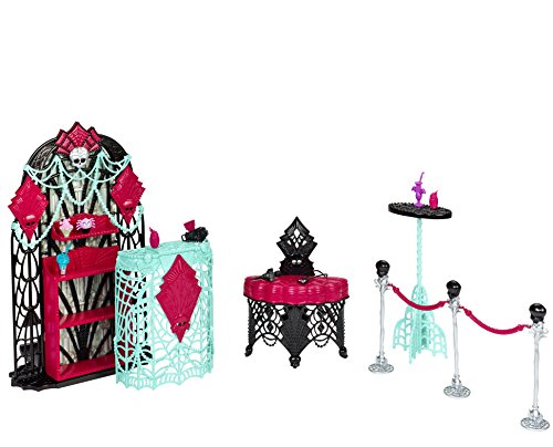 -. Feature : Frights, Camera, Action! / The ghouls have made it to Hauntlywood and are ready to walk the black carpet! / Stanchions with Skullette tops and cords help create the runway while an elaborately decorated podium sets the stage / Grab attention with the microphone or get backstage with the VIM (Very Important Monster) badge / Additional pieces include a quilted seat, display case and tall table for props or refreshments