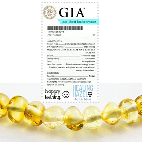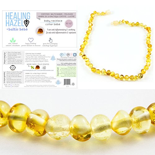 -. Binding : Baby Product -. Brand : Healing Hazel -. EAN : 0859722001112 -. Feature : Handmade with 100% certified Baltic amber / Must be in contact with the skin / May be in contact with plain water, however it is preferable to remove it before bathing or swimming to increase its lifespan / This product has a safety release and is accredited by the Consumer Product Safety Commission / You should be able to run two fingers along your baby's neck under the necklace -. IsAdultProduct : 0 -. Label : HEALING HAZEL -. Manufacturer : HEALING HAZEL -. Model : 6622254 -. MPN : CB-AB-P-02 -. PartNumber : CB-AB-P-02 -. ProductGroup : Baby Product -. ProductTypeName : BABY_PRODUCT -. Publisher : HEALING HAZEL -. Size : 10.5 inches -. Studio : HEALING HAZEL -. Title : 100% certified Balticamber pop clasp baby necklace by HEALING HAZEL - POLISHED HONEY 10 1/2' (reduce drooling & pain)' -. UPC : 859722001112