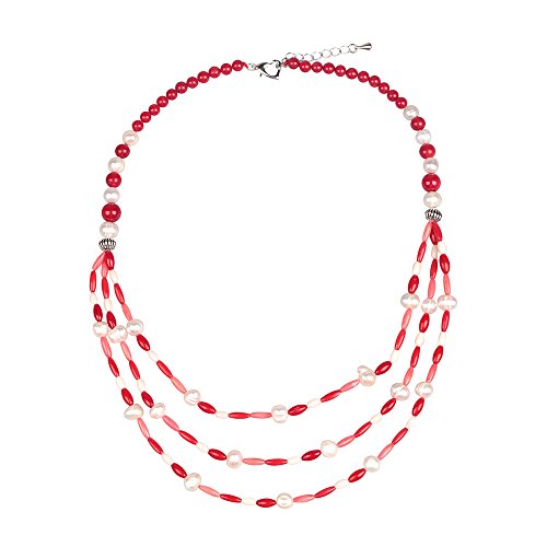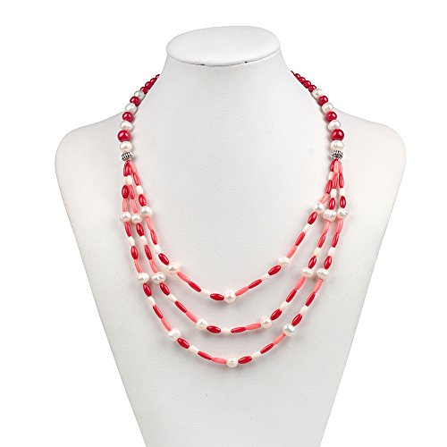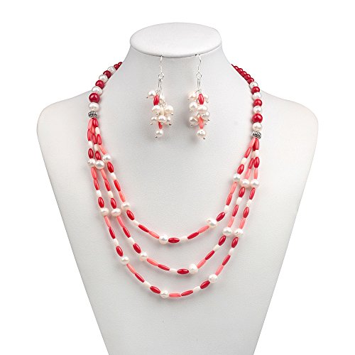 -. Title : 18" Simulated Coral & Cultured Freshwater Pearl 3-Row Necklace +Earrings