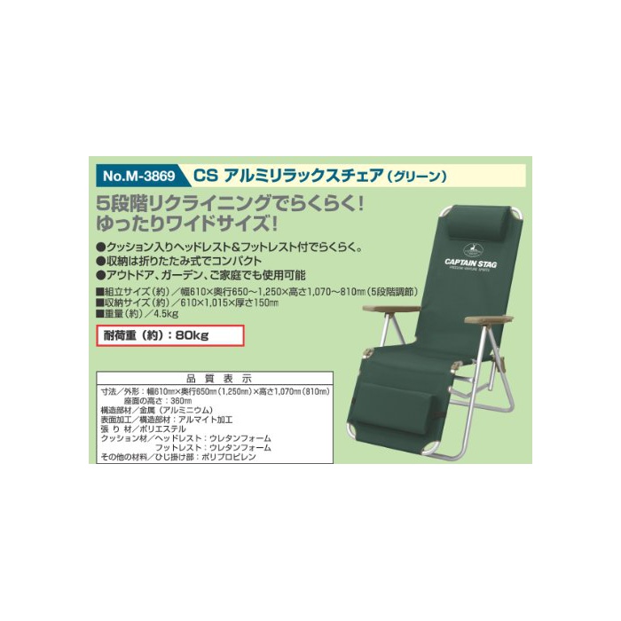 원본상품명: キャプテンスタッグ チェア CS アルミリラックス チェア グリ?ン M-3869