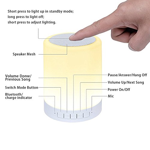 • Bluetooth Speaker Touch Activated Reading Lamp. The touch control night light is a dimmable bedside lamp 6 color changing Bluetooth speaker. Sensor technology, touch to change colors. Support iPhone, iPad, iPod, Samsung, Kindle, Android Smart Phones, Tablets and Cars.