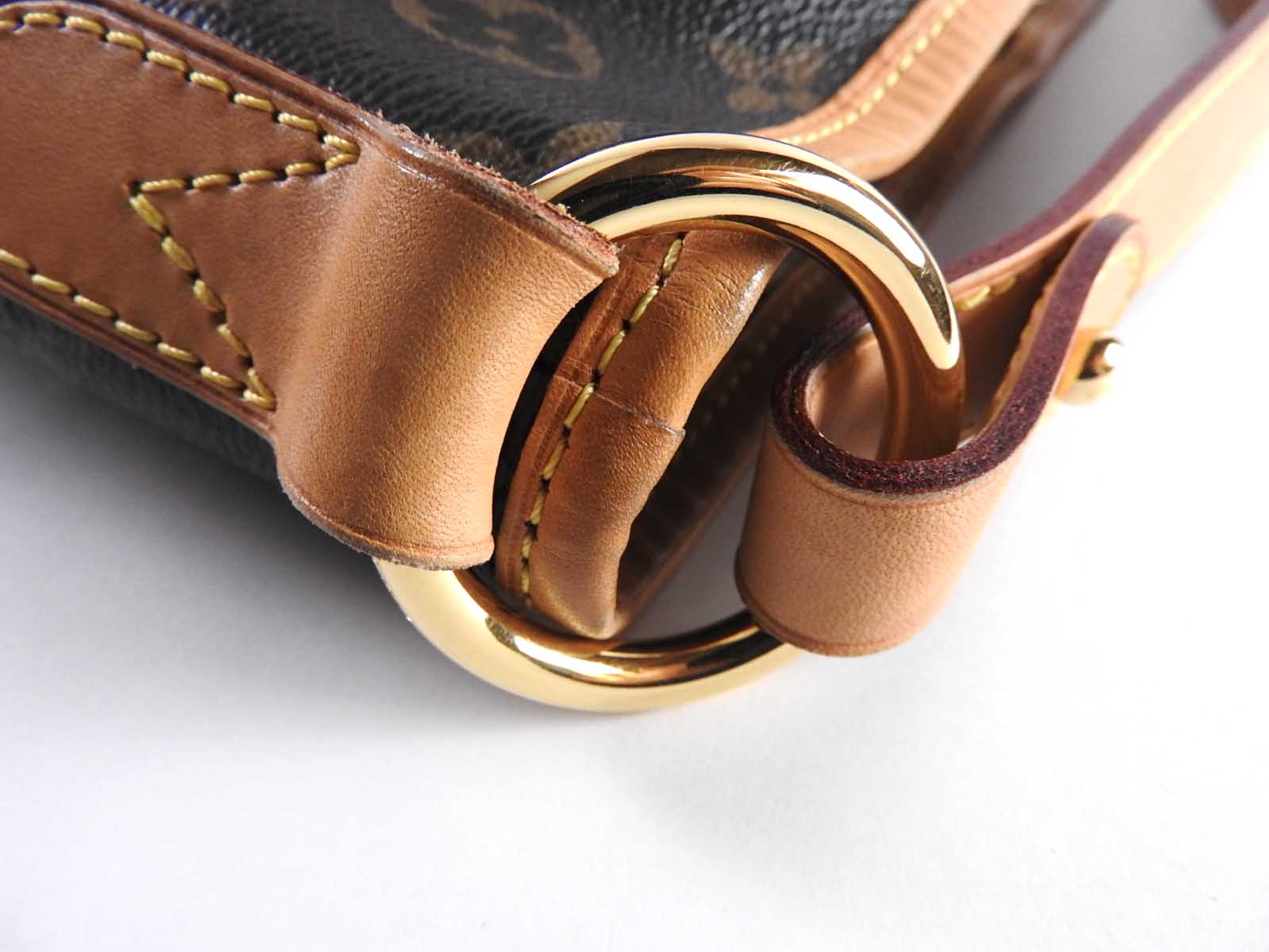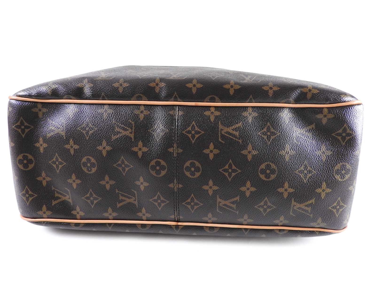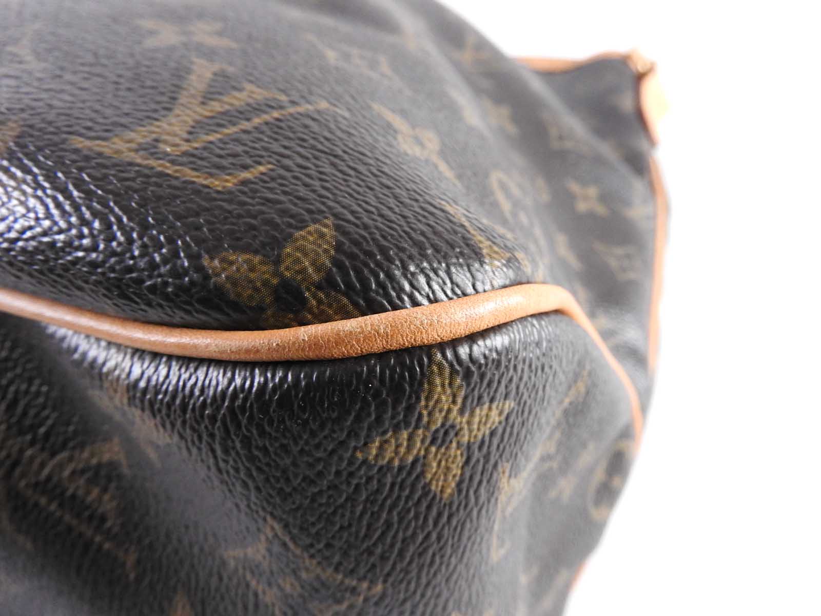 | Exterior | Monogram: Slightly used feeling. Slight stains. Leather: Used feeling. Slightly tanned. Some stains, wrinkles and abrasions in the trim around the top of the bag. |