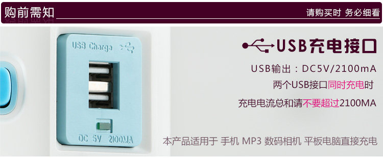 ★功率保护装置 ★双USB充电接口:DC5V/2000MA ★可冲iphone,HTC,三星,等知名品牌的智能手机,和平板电脑。 ★2个USB接口同时充电时,充电电流总和请不要超过2100mA |