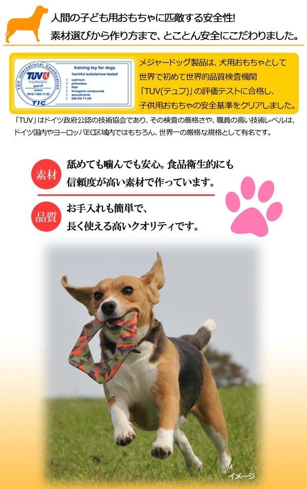 | 素材は耐久性が高く、ワンちゃんが噛んでも安心・安全なものを使用しています。ワンちゃんが長く楽しめるよう様々な工夫がなされているおもちゃです♪そのクオリティの高さは、ドッグトレーナーも愛用している程です! |