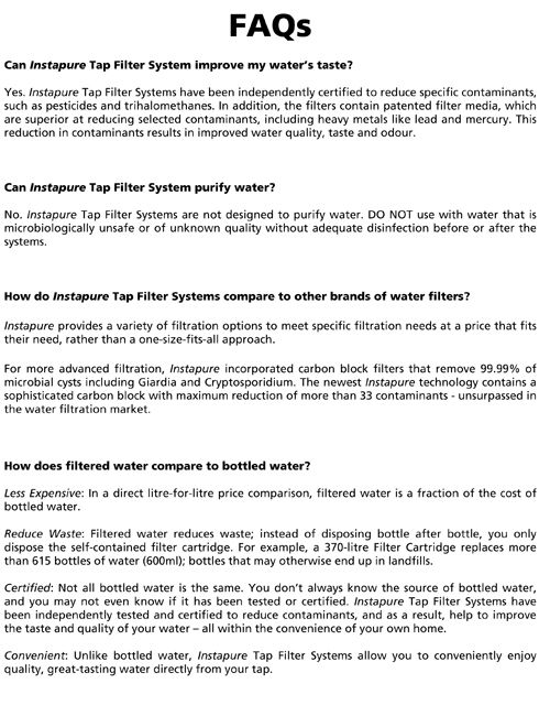 Instapure Tap Filter Systems can reduce chlorine, harmful trihalomethanes and other contaminants in our water. You can even skip boiling, drinking straight from the filter.