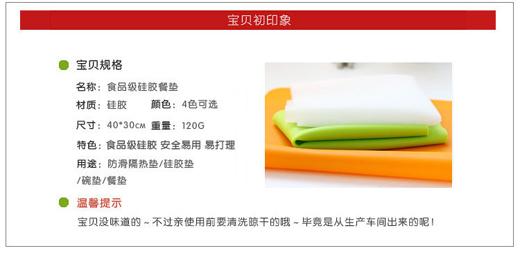 非常简洁的一款餐垫 ,材质为食品级硅胶材料,安全卫生,没有任何异味。产品来自专门的硅胶制品生产厂家,品质有保障,亲们可放心使用。