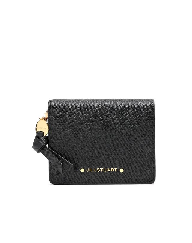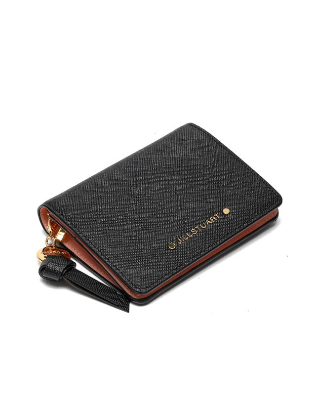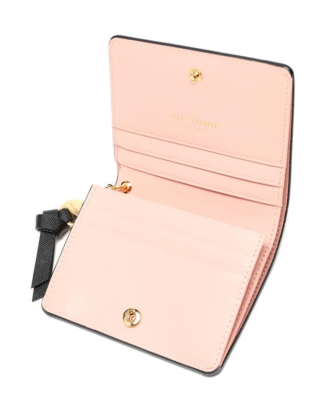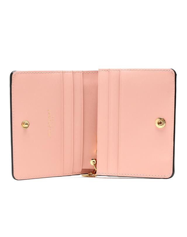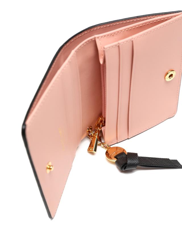 깔끔한 블랙 솔리드 디자인에 내부 핑크 배색과 금장 로고 참장식으로 포인트를 준 2단 반지갑 입니다.
