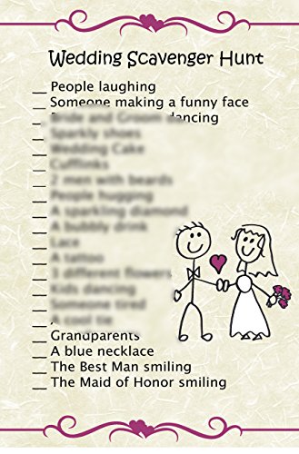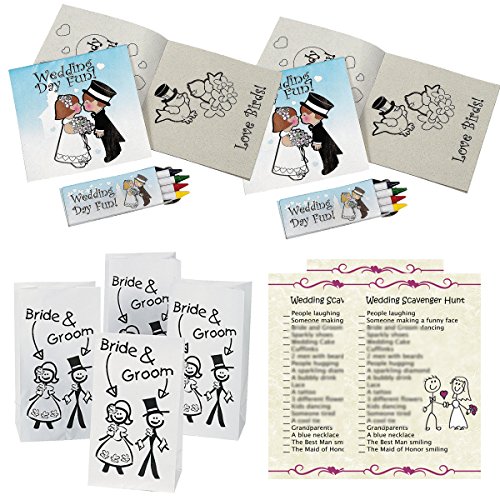 -. Feature : Keep Kids entertained at your Wedding! / 12 Individually packaged wedding coloring books and crayons / Kids will stay busy and have fun! / 25 Scavenger hunt sheets (great to combine with disposable cameras or use with cell phone cameras!) / Adorable wedding favors bags (12) with Bride and Groom art