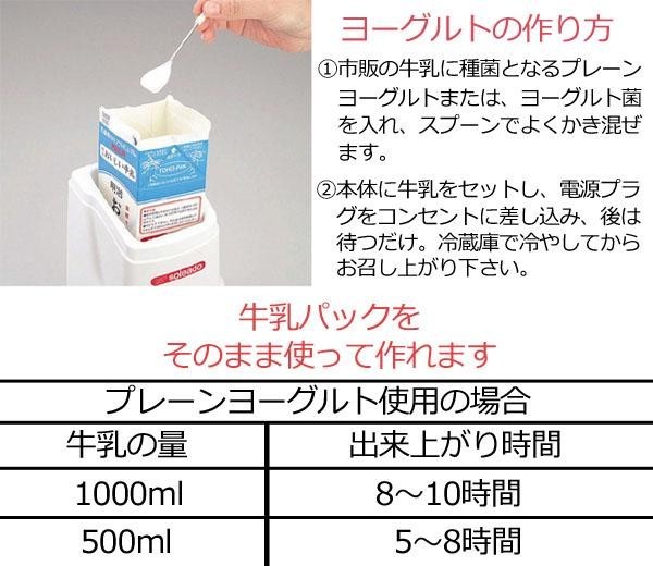 市販の牛乳に種菌となるプレーンヨーグルト、またはヨーグルト菌を入れてかき混ぜ、本体にセット。5~8時間で(牛乳500mlの場合)作りたてのヨーグルトが楽しめます♪ |