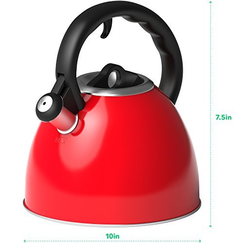 Vremi Pinkies Up Whistling Tea Kettle. This beautiful tea kettle features an old fashioned whistling sound when the water reaches its boiling point, with a modern stylish look. Comes in dome shaped stainless steel body with a matte brushed or enamel finish in 5 color options to match any kitchen stove top. Its heat resistant nylon handles feature a smooth finger grip trigger that instantly opens the pour spout for easy pouring. Holds 2 quarts (1.9 Liter) of water — generous enough for a medium tea infuser or coffee press. Lightweight with compact sleek construction, and compatible with gas and electric cooktops. Hand wash with warm water and gentle soap to preserve quality. For a morning cup of English Breakfast, a mid afternoon Green Tea pick-me-up, or an evening mug of Chamomile, look no further than our musical Whistling Tea Kettle.
