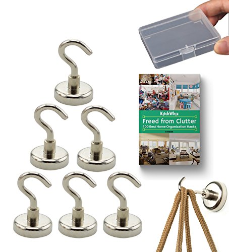 MIGHTY MAGNETIC HOOKS by KitchWhiz, ONLY Set of 6 Premium quality 50lb Heavy Duty Neodymium magnetic hooks with a FREE Storage Case and eBook. Ideal for Indoor / outdoor use. DeClutter your Space Now