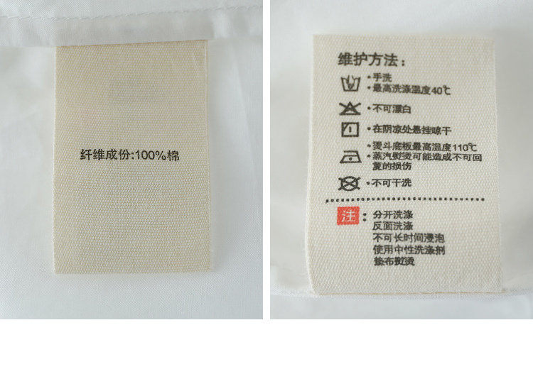 洗涤标准:不可浸泡不可漂白悬挂晾干40℃以下手洗110℃以下反面熨烫不可干洗