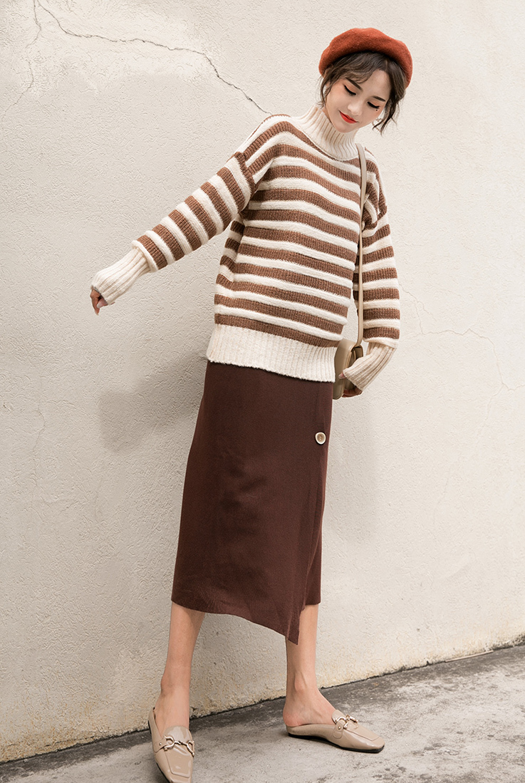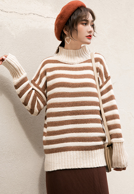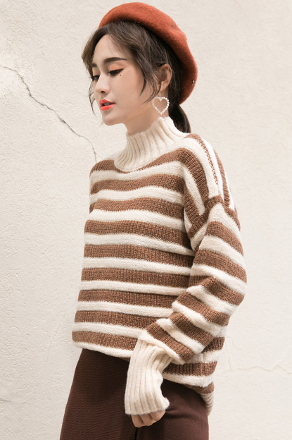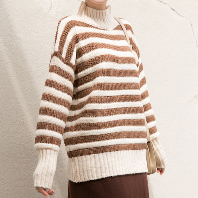 落ち着いた色合いが女性らしく、飽きのこないハイネックボーダーニットです。