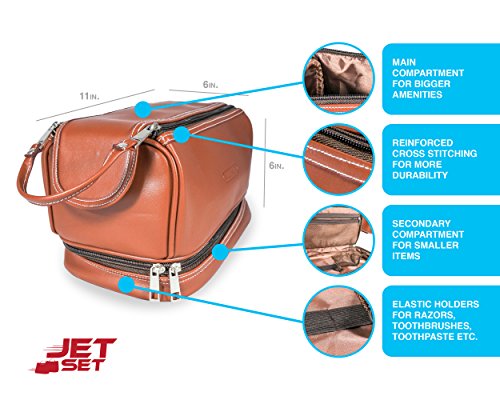 - Jetset Premium toiletry bag for men has two compartments. One big compartment is for holding all your large size amenities like perfumes, towels, shampoo etc. and another compartment at the bottom of the bag for smaller items like toothbrush, toothpaste, razors etc. This makes product organization very easy and intuitive.
