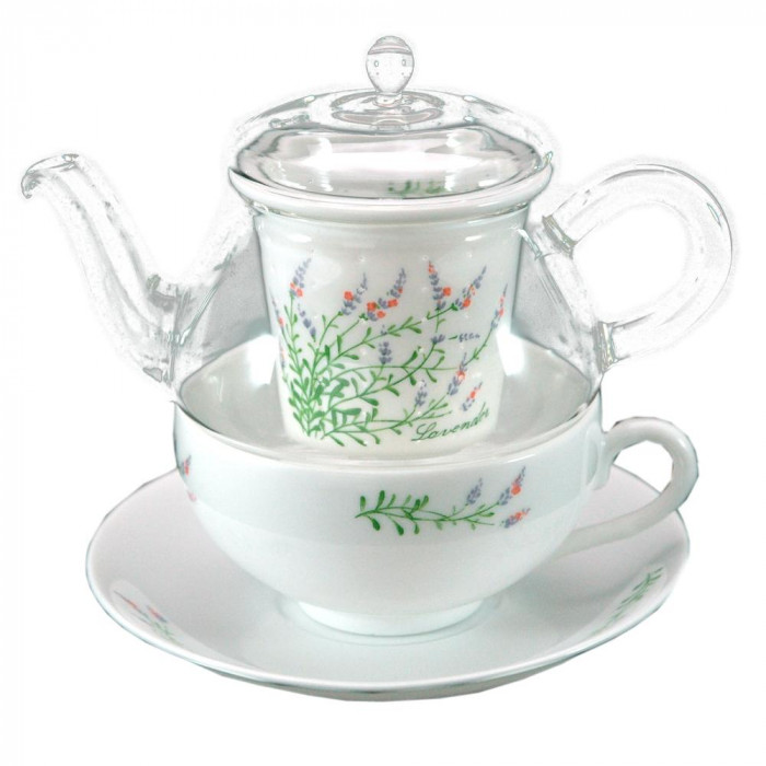 | 1人用ティーポットとティーカップがセットで、カップとポットが重なる形状が特徴の「ティーフォーワン」。ガラスのティーポットには陶磁器の茶こしをセットしました。ガラスの透明性と陶磁器のあざやかな絵柄が、上品でおだやかな時間を演出します。おもてなしやギフトにも最適☆ |