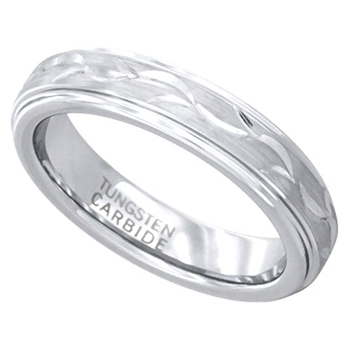 -. Title : Silver Finish 4.5mm Tungsten 900 TM Wedding Ring Ladies Vine Pattern Handcarved Recessed Edges Comfort fit, sizes 6-9