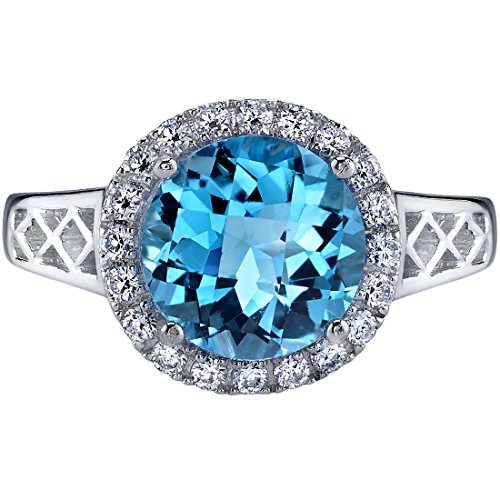 -. Feature : Center Stone: 2.50 carat Genuine Swiss Blue Topaz, Round Checkerboard Cut, 8.00mm Diameter, Lagoon Blue Hue with Brilliant Sparkle. / Side Stones: 20 pieces 0.20 carats total weight Cubic Zirconias. Round Brilliant Cut, F-G Color, VVS-VS Clarity. / Ring weighs 2.50 grams and is crafted out of 14 Karat White Gold. The 14K hallmark is etched inside the band. / Available in sizes 5 to 9, this trendy ring is made by skilled artisans using latest technology. / Perfect gift for Engagement, Brithday, Mothers Day, Anniversary, Valentines Day, Graduation or any other occasion. Arrives in a Signature Gift Box.