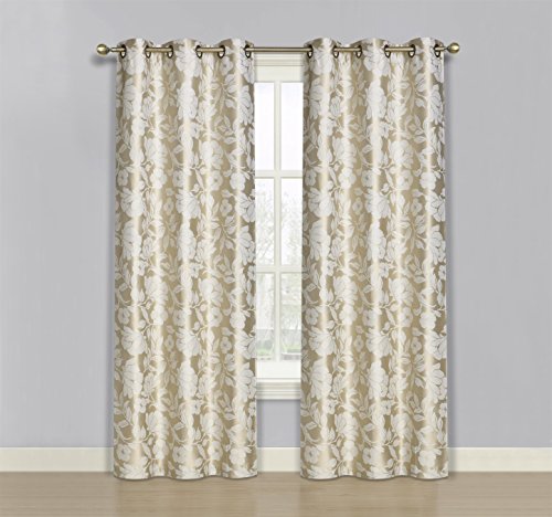 A Laura Ashley Duchess Window Curtain is a quick, simple update to suit any type of decor. Featuring a two-tone floral pattern in soft shades of taupe and white, this panel is versatile enough for practically any room. With a metal grommet top for easy installation and lovely drape, this curtain is sure to delight. Woven Jacquard is 100% polyester, machine wash cold, gentle cycle, tumble dry low. Grommet top panel pairs are available in 76"x84"L and 76" x 96"L.Feature